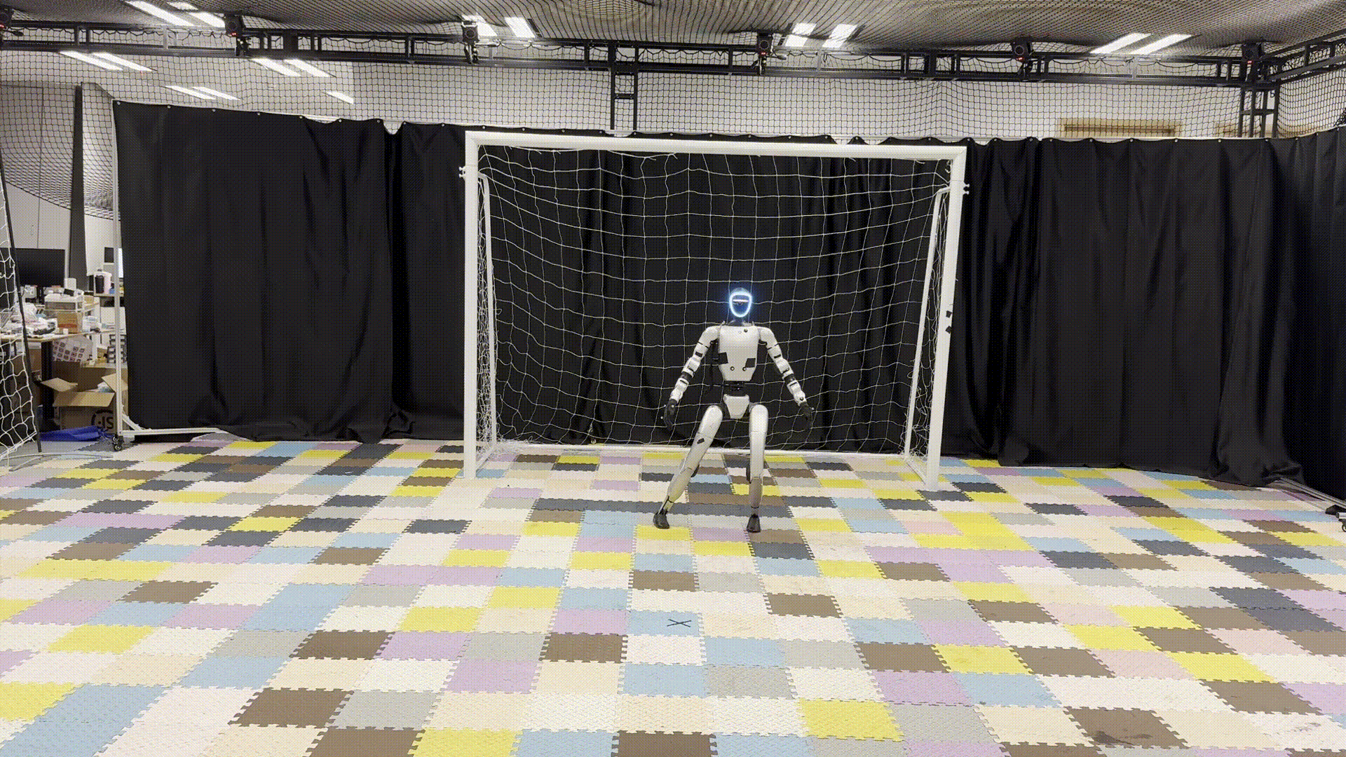 Humanoid Goalkeeper learns a single end-to-end RL policy, executing agile, human-like motions to intercept flying balls, as well as performing tasks such as escaping a ball using jump and squat motions.